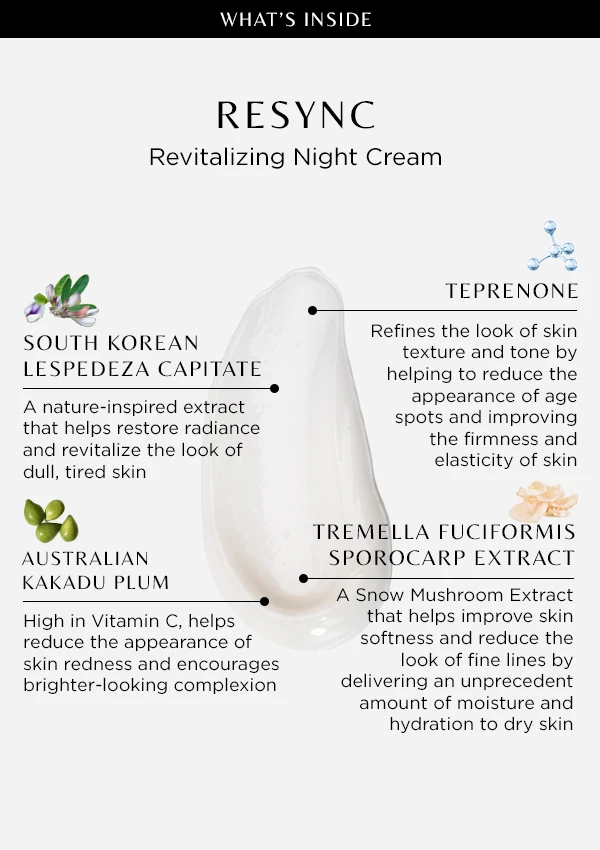 Resync is a Revitalizing Night Cream with antioxidant-rich extracts—like Snow Mushroom and Kakudu Plum—that quench skin with long-lasting moisture to help restore radiance and revitalize the look of skin, all while you sleep.